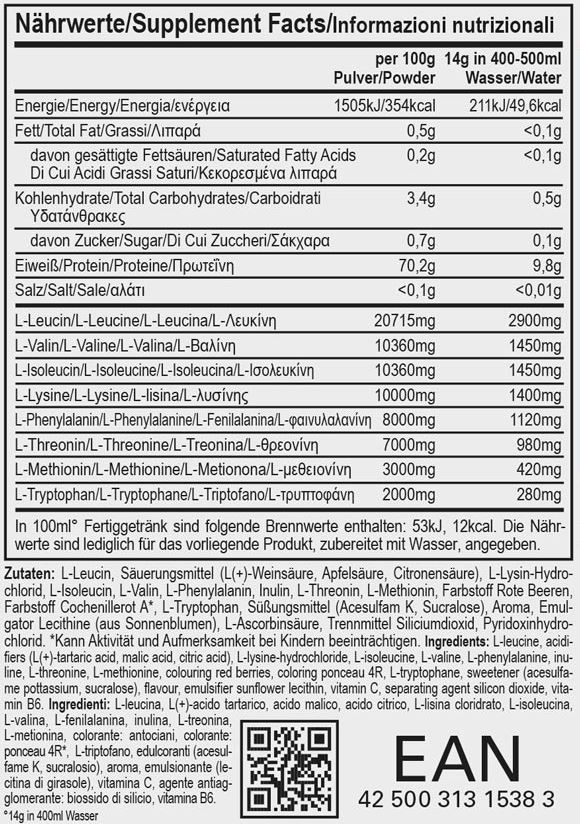 L-Leucin, L-Lysin Hydrochlorid, Citronensäure, L-Valin, L-Isoleucin, L-Threonin, Aroma, L-Methionin, Maltodextrin, Natürliches Aroma, L-Phenylalanin, Natriumchlorid, L-Tryptophan, Trennmittel Siliciumdioxid, Süssstoffe Acesulfam K und Sucralose, Farbstoff Beta Carotin.