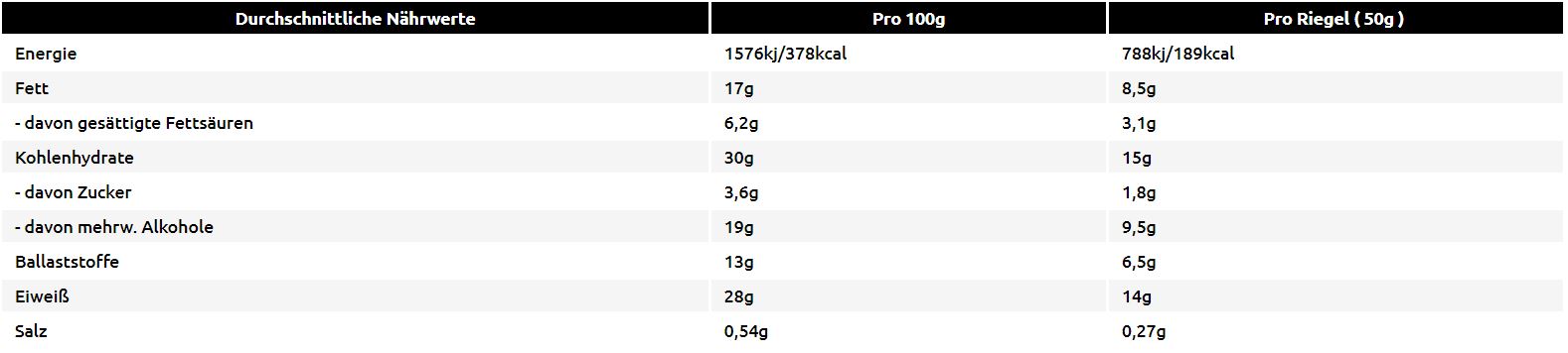 Brownie: Milcheiweiß, Haselnusspaste, Oligofruktosesirup, Mürbegebäckstückchen 11% (Süßungsmittel Maltit, Isomalt, Erythritol, Kartoffelstärke, Maismehl, Butter, Reismehl, modifizierte Stärke, Tapiokastärke, Speisesalz, Aromen, Vanille Extrakt, Backtriebmittel Natriumhydrogencarbonat), Polydextrosesirup (Polydextrose, Wasser), Süßungsmittel Maltit, Kakaomasse 7,1%, Feuchthaltemittel Glycerin, kakaohaltige Sojaprotein-Crispies 5,5% (Sojaprotein-Isolat, Tapiokastärke, stark entöltes Kakaopulver), fettarmer Kakao 5,3%, Molkenprotein-Isolat, Haselnüsse, Kakaobutter, Inulin, Aromen, Emulgator Lecithine (aus Soja).