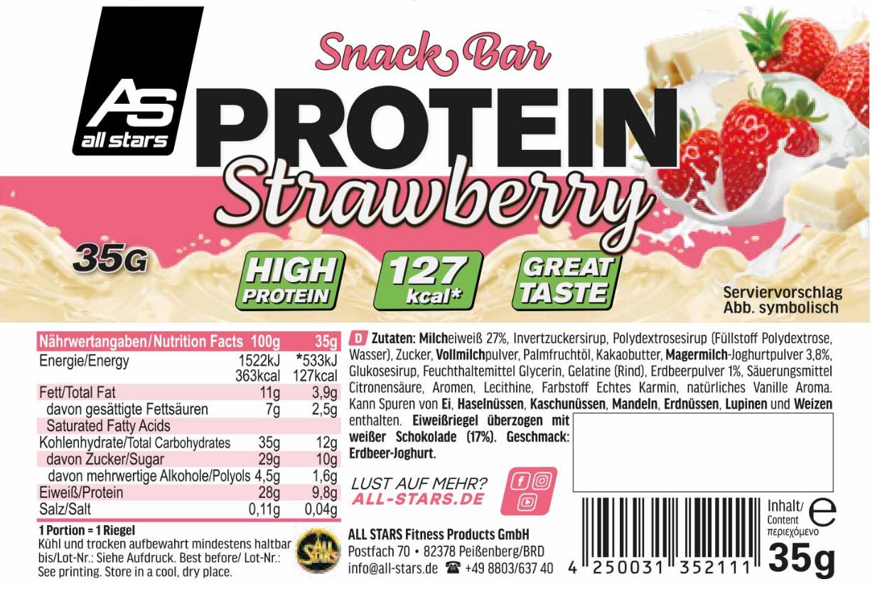 Eiweiss-Riegel eignen sich hervorragend zur Proteinversorgung für zwischendurch oder unterwegs und stellen eine hochwertige Alternative zum »Naschen« von Schokolade oder anderen Süßigkeiten dar. ALL STARS Riegel gibt es in vielen unterschiedlichen Grössen. Alle Riegel bestehen aus hochwertigen Eiweissquellen. Der Proteinanteil liegt je nach Riegelsorte zwischen 28% und 50%.