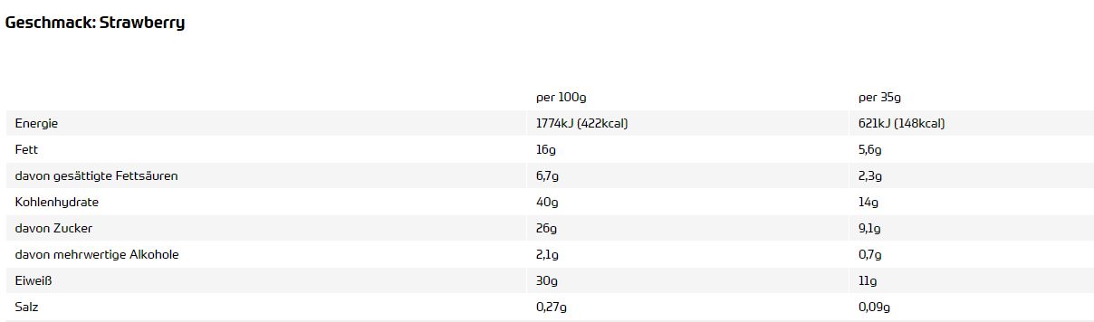 - 35g Eiweissriegel mit Schokoladenüberzug (z.T. mit Fruchtstückchen).
