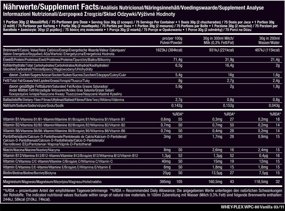 Geben Sie 2 Messlöffel (40g) WHEY PROTEIN in 400 ml Magermilch oder 300 ml Wasser und lösen Sie das Pulver durch kräftiges Herumrühren auf. Am einfachsten gelingt die Zubereitung in einem Mixer. Trinken Sie bis zu 3 Portionen WHEY PROTEIN täglich, am besten zum Frühstück sowie vor und unmittelbar nach dem Training. Für optimale Trainingsergebnisse sollten Sie WHEY PROTEIN täglich verzehren.