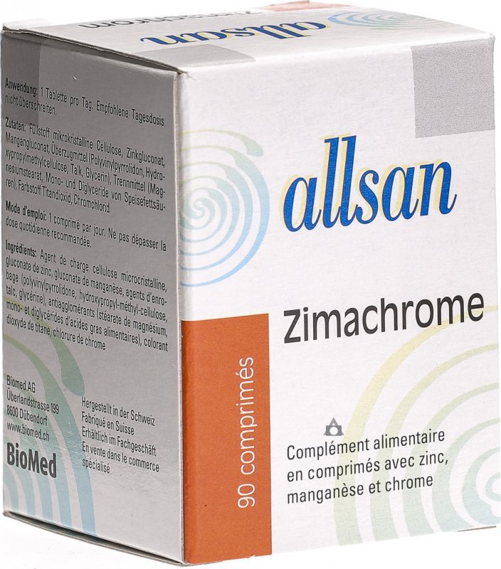 Die Nahrungsergänzung allsan Zimachrom enthält die Vitalstoffe Zink, Mangan und Chrom. Diese drei Spurenelemente sind Bestandteile wichti-ger Enzymsysteme im Kohlenhydratstoffwechsel. Bei Personen, welche z.B. durch eine unausgewogene Ernährung nicht optimal mit diesen Vital-stoffen versorgt sind, kann allsan Zimachrom einen gewissen Einfluss auf die Kohlenhydratverwertung ausüben.