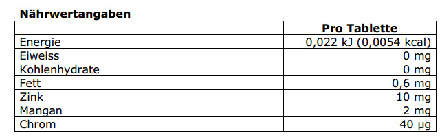 Füllstoff (mikrokristalline Cellulose), Zinkgluconat, Mangangluconat, Überzugmittel (Polyvinylpyrrolidon, Hydroxypropylmethylcellulose, Talk, Glycerin), Trennmittel (Magnesiumstearat, Mono- und Diglyceride von
