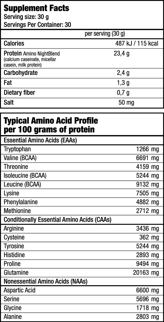 Amino NightBlend (calcium caseinate, micellar casein, milk protein), cocoa powder, sweetener (E955), thickener (E466), flavor, stabilizer: E340, anti caking agent: E551, emulsifier: E471, color: E160a.