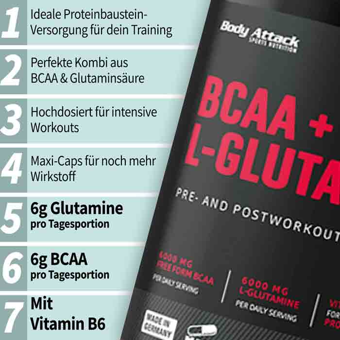 Das Produkt Body Attack BCAA + Glutaminsäure 12000 liefert die drei aufgeführten Aminosäuren sowie Glutaminsäure in den beliebten Maxi-Caps, die noch mehr Wirkstoff als herkömmliche Kapseln enthalten und sich leicht mit etwas Flüssigkeit einnehmen lassen. Eine Tagesportion Body Attack BCAA + Glutaminsäure 12000 besteht aus 10 Kapseln und enthält 6000 mg L-Glutaminsäure und 6000 mg BCAA.