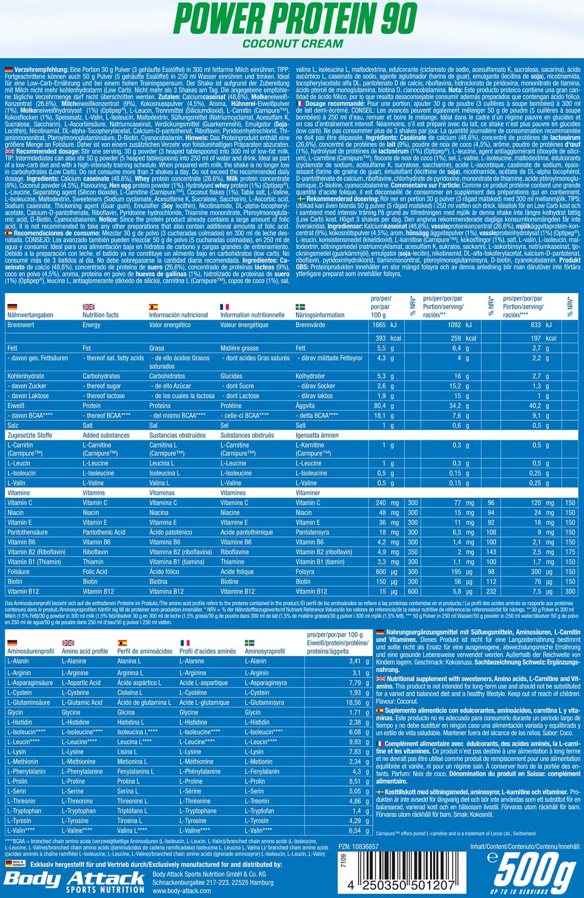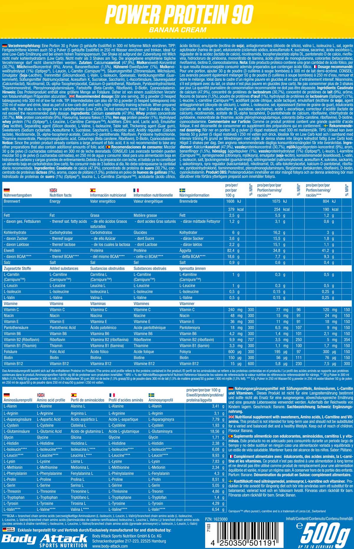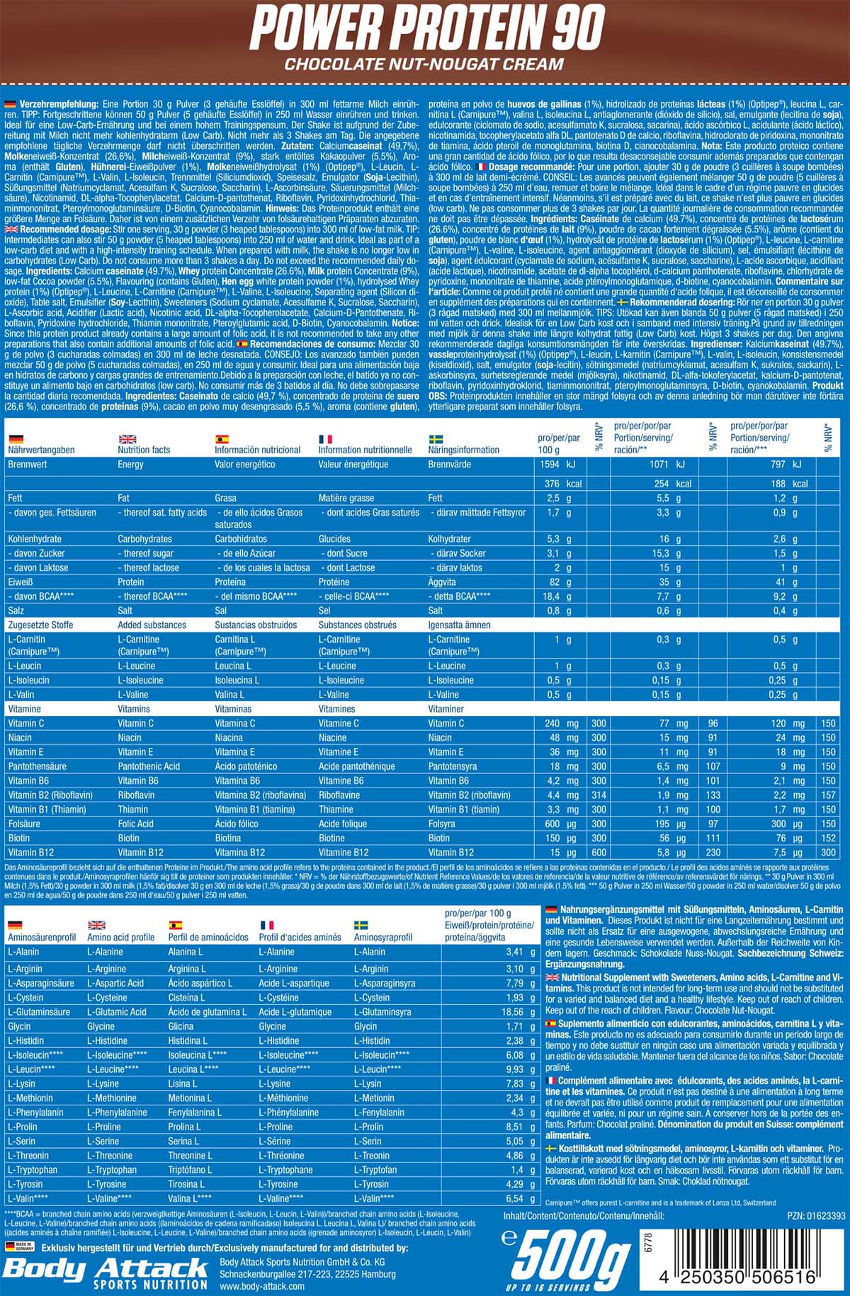 Wenn Sportler einen erhöhten Energiebedarf haben und zu wenig L-Carnitin über die Nahrung aufnehmen, ist eine Zufuhr von L-Carnitin sinnvoll. Daher enthält das Body Attack Power Protein 90 auch 500 mg Carnitin pro Shake*.