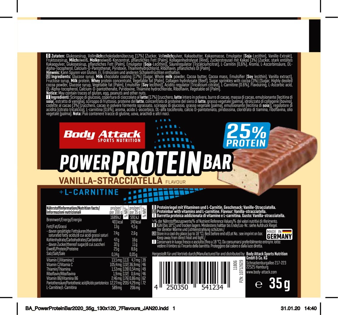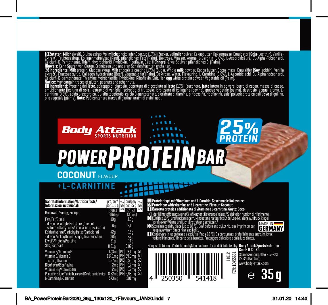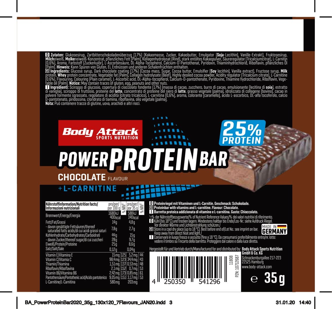 Proteine zum Anbeißen. Umhüllt von knackiger Schokolade macht der POWER PROTEIN-BAR seinem Namen alle Ehre. Satte 25 % hochwertiges Milcheiweiß sind zum Erhalt der Muskeln in jedem Riegel enthalten. Auch als Kraftpaket schlägt sich unsere Köstlichkeit hervorragend durch den Anteil an Kohlenhydraten. Je Protein Bar stehen dir direkt nach dem Training 16 g schnell verfügbare Kohlenhydrate zur Verfügung.