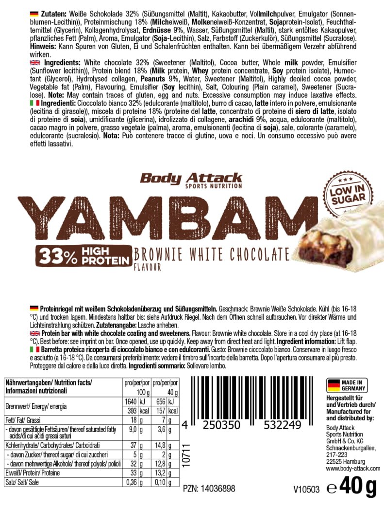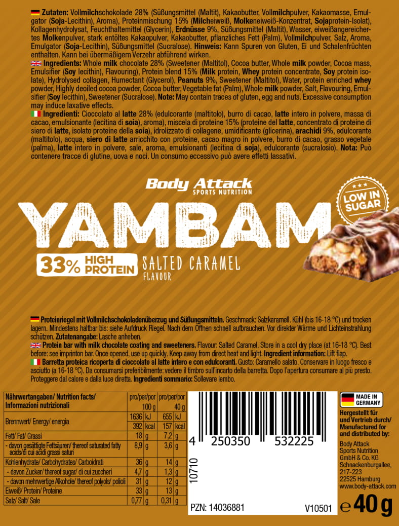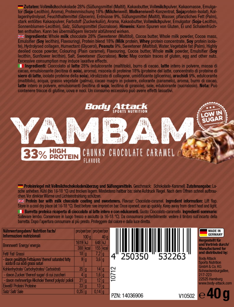 Vergiss alle Proteinriegel, die Du bisher probiert hast! Denn jetzt macht es YAMBAM in Deinem Mund! Der sensationelle Sportsnack von Body Attack mit leckeren Erdnüssen liefert nicht nur einzigartige Zutaten, er entfacht noch dazu eine echte Geschmacksexplosion.