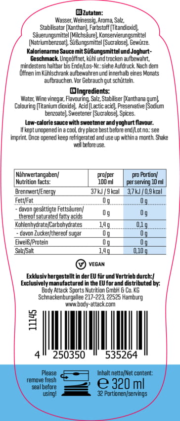 Body Attack hat eine fett- und kalorienarme Variante des beliebten Yoghurt Dressing entwickelt. Das cremig leichte Dressing passt perfekt zu frischen Blattsalaten oder aber auch zu Gurken und Tomaten. Aufgrund des frischen Geschmacks ist es auch bei sommerlichen Temperaturen ein absolutes Highlight. Und das Beste daran ist, dass es bei vollem Geschmack kaum Kalorien, kein Fett und keine Kohlenhydrate liefert.