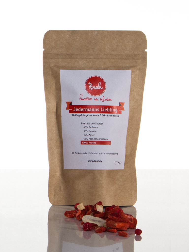 Zutaten: 40% Erdbeere, 32% Banane, 16% Apfel und 12% rote Johannisbeere