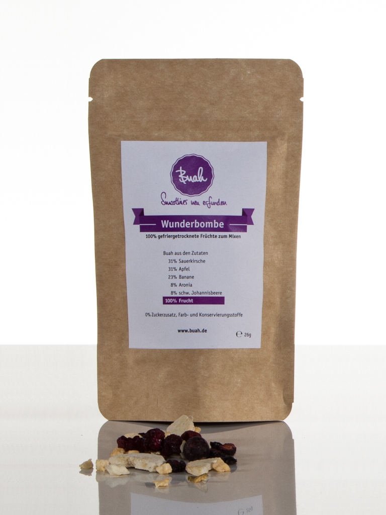 Zutaten: 31% Sauerkirsche, 31% Apfel, 23% Banane, 8% Aronia und 8% schw. Johannisbeere