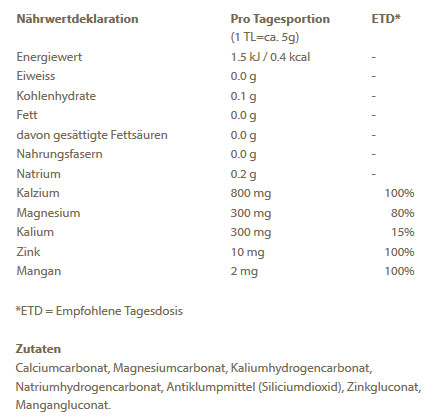 - Eine Tagesdosis enthält den durchschnittlichen Tagesbedarf an Kalzium, Magnesium, Zink und Mangan!
