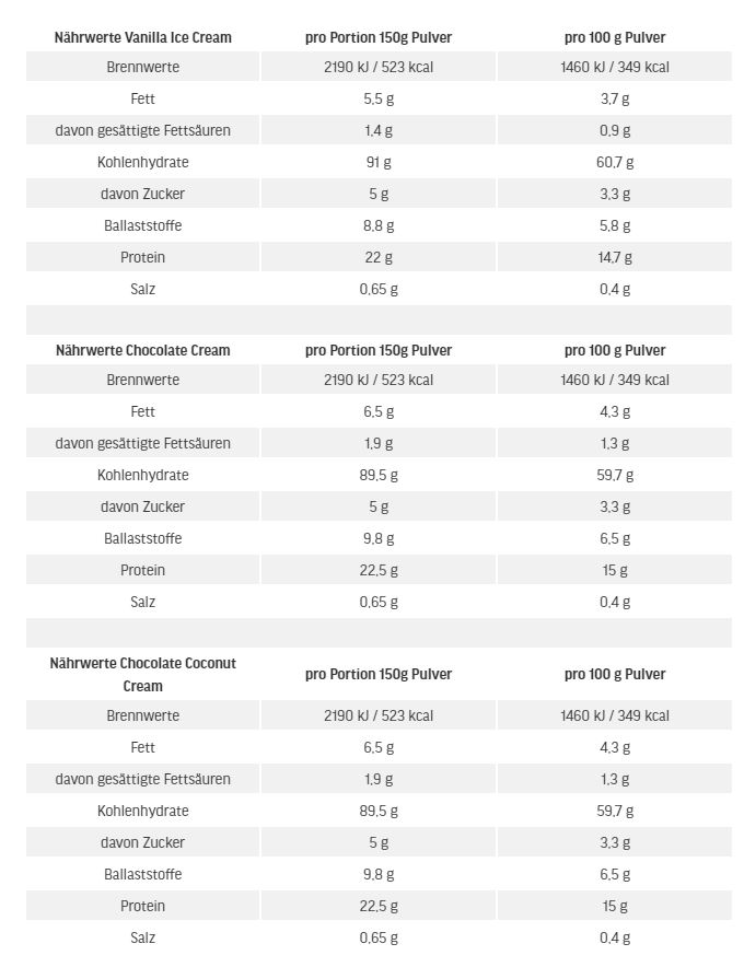 Chocolate Coconut Cream: 86% Kohlenhydratmischung (Vollkornreismehl, Vollkornhafermehl, Buchweizenmehl, Kamutmehl, Quinoamehl), Molkeneiweißkonzentrat, Kakaopulver, Sonnenblumenöl-Pulver, Aromen, Salz, Süßstoffe (Acesulfam K, Natrium Cyclamat, Sucralose, Sodium Saccharin), Emulgator (Sojalecithin)