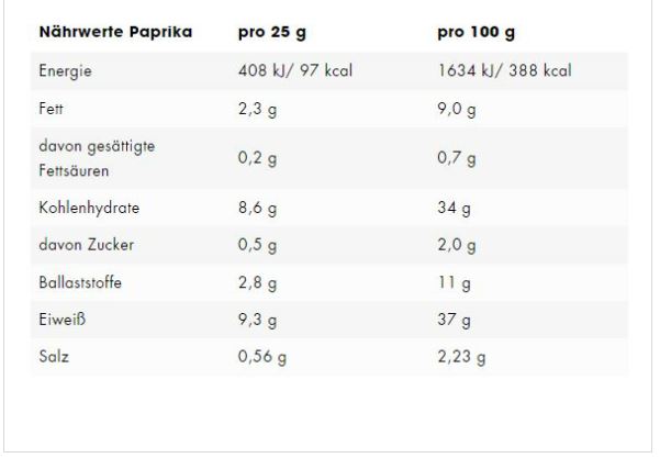 Soja- Proteinchips (Sojaprotein 48%, Tapiokastärke, Kartoffelgranulat, Kartoffelflocken, Kartoffelstärke, Salz), Sonnenblumenöl, Paprikawürzmischung (Zwiebelpulver, Gewürz (Paprika), Zucker, Dextrose, Salz, Hefeextrakt, Aroma, Knoblauchpulver, Farbstoff (Paprikaextrakt)), Antioxidationsmittel (Extrakt aus Rosmarin). Kann Spuren von Gerste, Hafer und Weizengluten enthalten.
