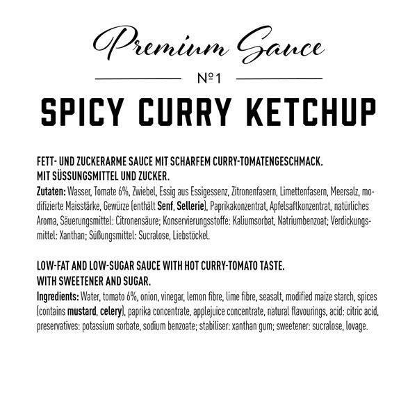 Wasser, Tomate 6%, Zwiebel, Essig aus Essigessenz, Zitronenfasern, Meersalz, modifizierte Maisstärke, Gewürze (enthält Senf, Sellerie), Paprikakonzentrat, Apfelsaftkonzentrat, natürliches Aroma, Verdickungsmittel: Xanthan, Konservierungsstoffe, Kaliumsorbat, Natriumbenzoat, Farbstoff: Carotin, Süssungsmittel: Sucralose, Liebstöckel.