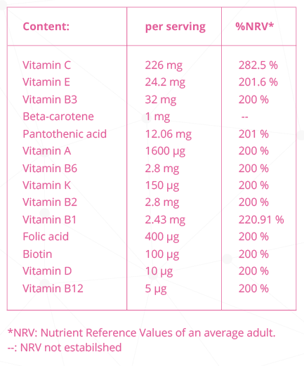 Anti-caking agent (microcrystalline cellulose), dry extract of acerola (Malpighia emarginata, 50 % vitamin C), vitamin C (L-ascorbic acid), vitamin E (D,L-alpha-tocopheryl acetate), vitamin B3 (nicotinamide), beta-carotene, anti-caking agent (magnesium stearate), pantothenic acid (D-pantothenate, calcium), vitamin A (retinyl acetate), anti-caking agent (silicon dioxide), vitamin B6 (pyridoxine hydrochloride), vitamin K (phylloquinone), vitamin B2 (riboflavin), vitamin B1 (thiamin hydrochloride), folic acid (pteroylmonoglutamic acid), D-biotine, vitamin D (cholecalcipherol) and vitamin B12 (cyanocobalamin).