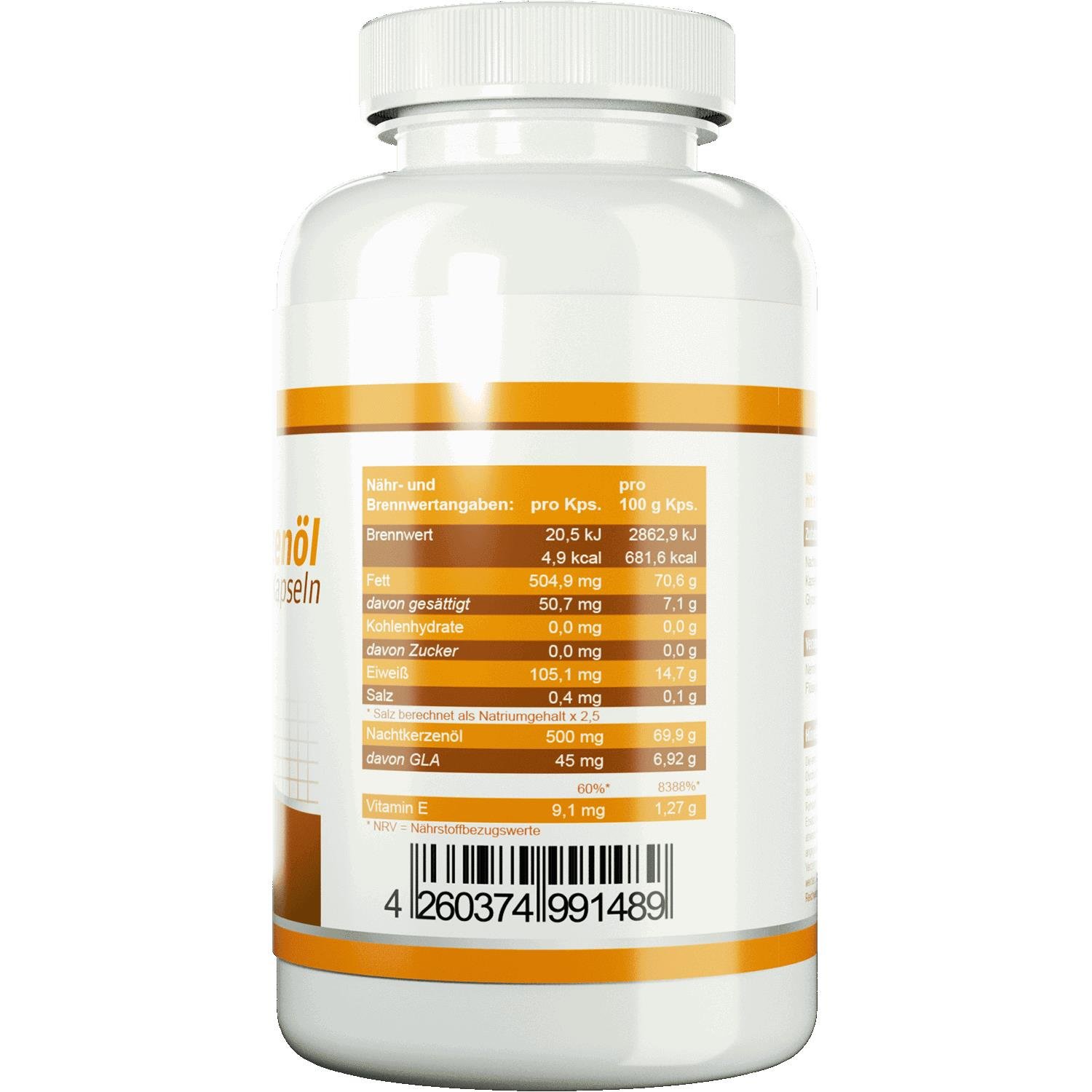 Nachtkerzenöl 500,0 mg (Gamma-Linolensäure > 45,0 mg) RRR-alpha-Tocopherol-Konzentrat 15,0 mg (Vitamin E 9,1 mg -TE )