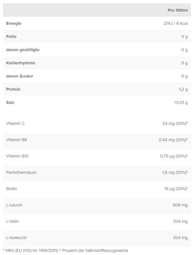 Wasser, Kohlensäure, L-Leucin (0,6%), Säuerungsmittel (Citronensäure), L-Isoleucin (0,3%), L-Valin (0,3%), Tee-Extrakt (0,12%), Aroma, Koffein (0,03%), Guaranaextrakt, Süßstoff (Sucralose), Vitamin C, Pantothensäure, Vitamin B6, Biotin, Vitamin B12