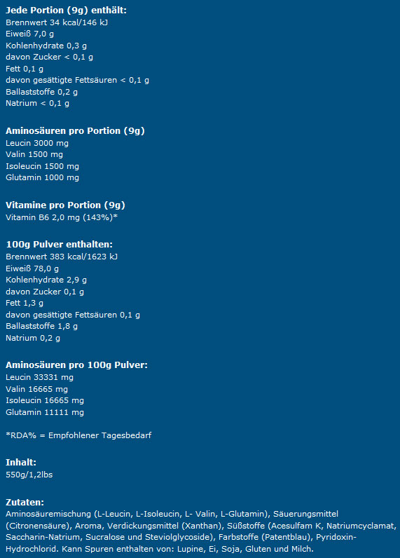 Aminosäuremischung (L-Leucin, L-Isoleucin, LValin, L-Glutamin, Emulgator Sojalecithin), Säuerungsmittel (Citronensäure), Aroma, Verdickungsmittel (Xanthan), Süßstoffe (Sucralose und Steviolglycoside), Pyridoxin Hydrochlorid, Farbstoffe (Patentblau). Kann Spuren enthalten von: Lupine, Ei, Gluten und Milch.