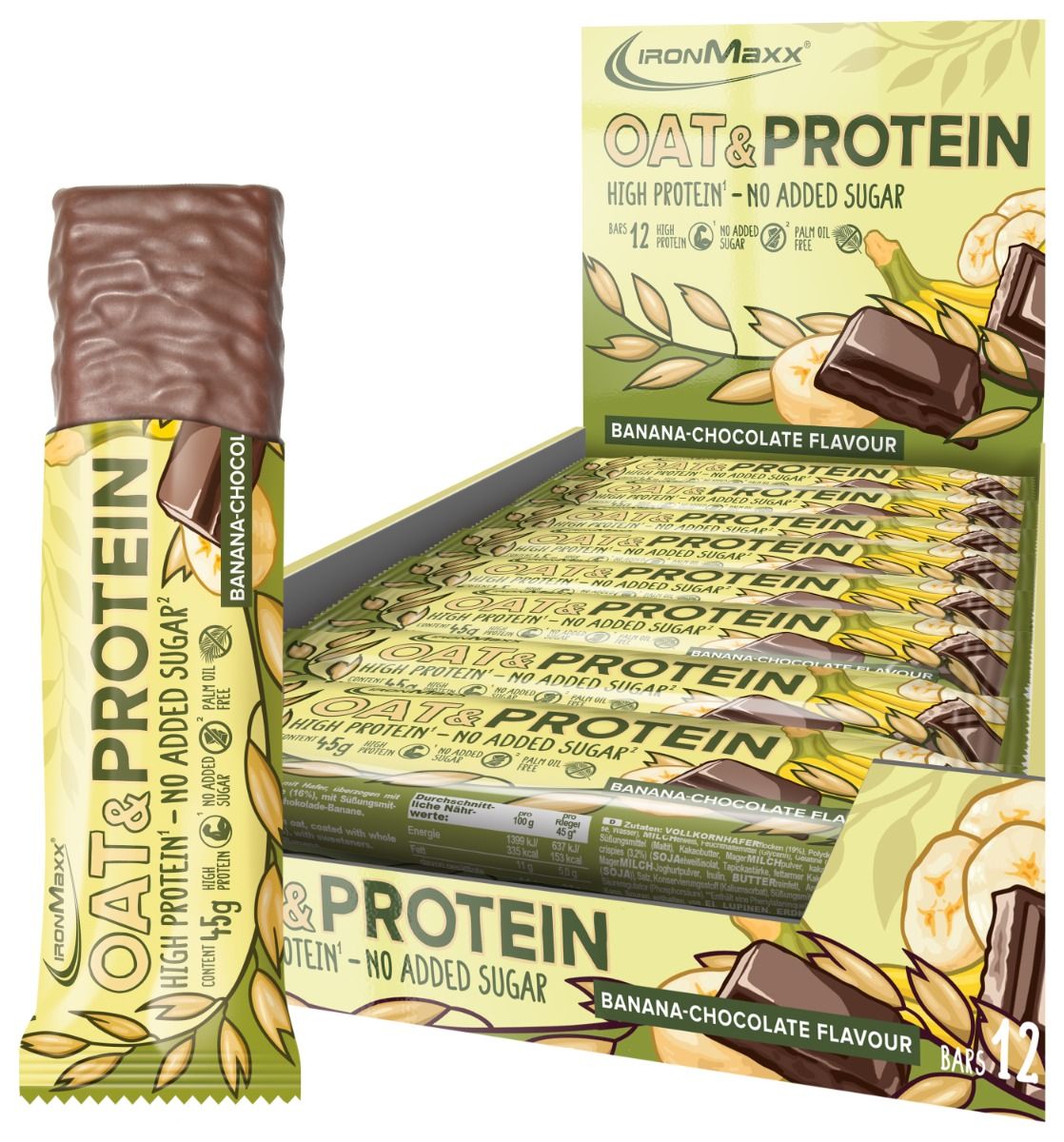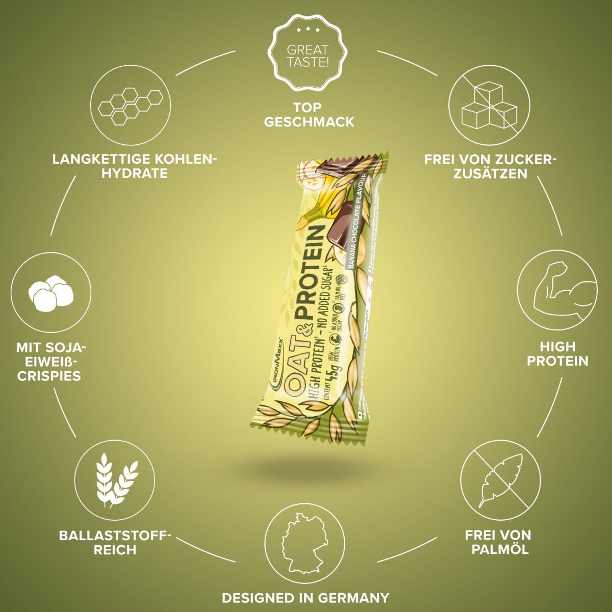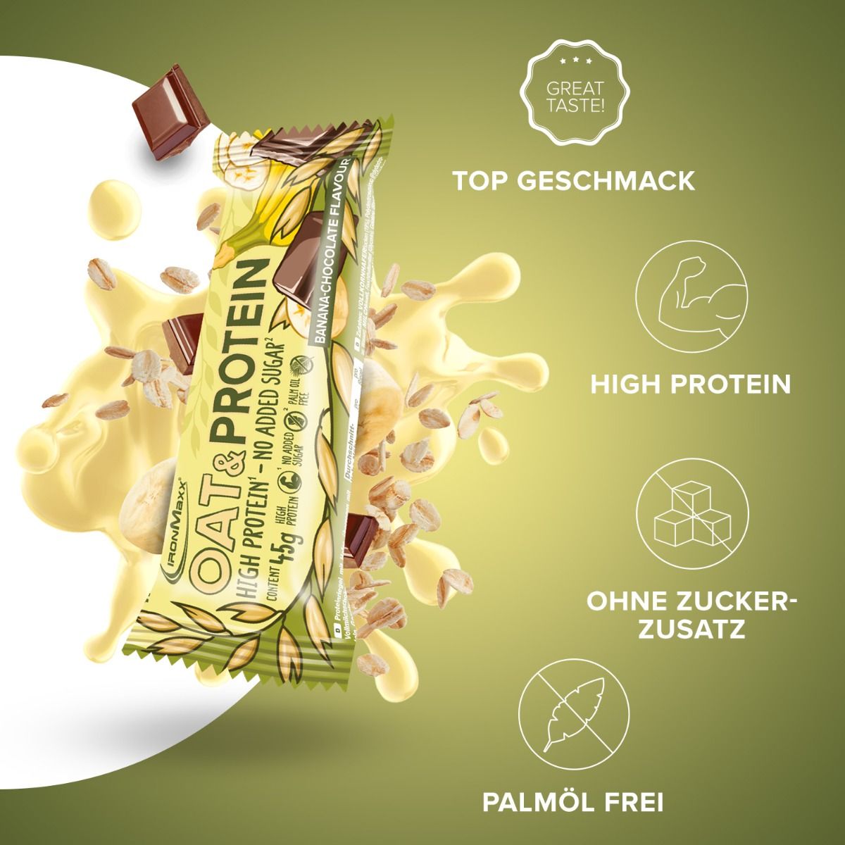 In diesem Produkt sind je nach Geschmackssorte echte Fruchtstücke enthalten. Auch dadurch hat der Oat & Protein Bar von IronMaxx® einen Eigenzuckeranteil. Auf zusätzlichen Zucker haben wir bei der Herstellung dieses Proteinriegels aber bewusst verzichtet. Dadurch ist er nämlich auch für Low-Sugar-Phasen und generell für Diätphasen bestens geeignet. Obwohl wir komplett auf zugesetzten Zucker verzichten, ist dieser High Protein Riegel ein Gaumenschmaus. Er ist in mehreren Geschmacksrichtungen erhältlich, u.a. in Banana-Chocolate, fruchtigem Blueberry Flavour und Raspberry Flavour. IronMaxx® hat bei der Produktion auf Palmöl verzichtet! Du genießt mit dem Oat & Protein Bar also nicht nur einen vollwertigen Snack, sondern setzt dich auch noch für die Umwelt ein! Eine Win-win-Situation also.