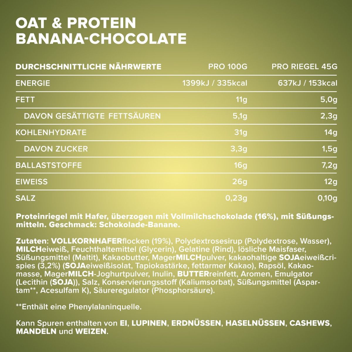 Banana-Chocolate: VOLLKORNHAFERflocken (19%), Polydextrosesirup (Polydextrose, Wasser), MILCHeiweiß, Feuchthaltemittel (Glycerin), Gelatine (Rind), lösliche Maisfaser, Süßungsmittel (Maltit), Kakaobutter, MagerMILCHpulver, kakaohaltige SOJAeiweißcrispies (3,2%) (SOJAeiweißisolat, Tapiokastärke, fettarmer Kakao), Rapsöl, Kakaomasse, MagerMILCH-Joghurtpulver, Inulin, BUTTERreinfett, Aromen, Emulgator (Lecithin (SOJA)), Salz, Konservierungsstoff (Kaliumsorbat), Süßungsmittel (Aspartam**, Acesulfam K), Säureregulator (Phosphorsäure).