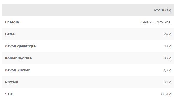 Kakaomasse, Süßungsmittel (Maltit), SOJAeiweißisolat, VollMILCHpulver, Molkenprotein (MILCH), Kakaobutter, Reismehl, BUTTERreinfett, Emulgator (Lecithine (SOJA)), Vanille-Extrakt. Kann Spuren enthalten von GLUTEN, EI, ERDNÜSSEN und SCHALENFRÜCHTEN. Übermäßiger Verzehr kann abführend wirken. 1 Proteine tragen zu einer Zunahme an Muskelmasse bei. Eine ausgewogene und abwechslungsreiche Ernährung und eine gesunde Lebensweise sind wichtig. 2 Enthält von Natur aus Zucker. 3Mindestens 30% weniger Kohlenhydrate gegenüber herkömmlichen Schokosnacks.