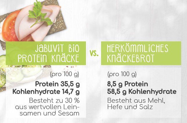 Es ist eine tolle Alternative zu Proteinriegeln oder Shakes um mehr Protein zu sich zu nehmen. Selbst zu Proteinbrot ist es eine leckere Abwechslung, da es besonders knusprig ist und herzhaft würzig. Mit einer Mahlzeit bestehend aus 3 Scheiben JabuVit Bio Protein Knäcke (ca. 33g/ Scheibe) nimmt man bereits 35g Protein zu sich. Diese lassen sich lecker mit Quark oder Frischkäse bestreichen und für die, die es süß mögen, auch noch mit Body Attack Dessert Sauce toppen. Eine tolle Kombination ist auch das knusprige JabuVit Bio Protein Knäcke mit den leckeren Body Attack Protein Nut Choc Sorten, von Haselnuss bis weiße Schokolade ist da für jeden etwas dabei.