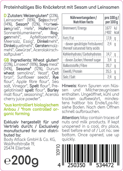 Weizengluten (23%), Leinsamen (18%), Sojaschrot (14%), Sesam (12%), Hartweizengriess, Hefe, Haferkleie, Sonnenblumenkerne, Roggenmehl, Apfelfasermehl, Meersalz, Essig, Dinkelmehl, Dinkelquellmehl, Gerstenmalzmehl, Gewürze, Acerolakirschsaftpulver. aus kontolliert biologischem Anbau.