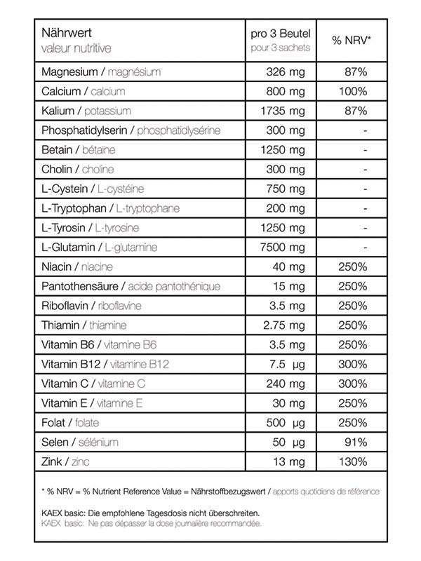 Folat, Magnesium, Niacin, Pantothensäure, Riboflavin, Vitamin B12, Vitamin B6, Vitamin C tragen zur Verringerung von Müdigkeit und Ermüdung, Pantothensäure zu einer normalen geistigen Leistung und Zink zu einer normalen kognitiven Funktion bei. KAEX basic enthält zudem Cholin und Phosphatidylserin.