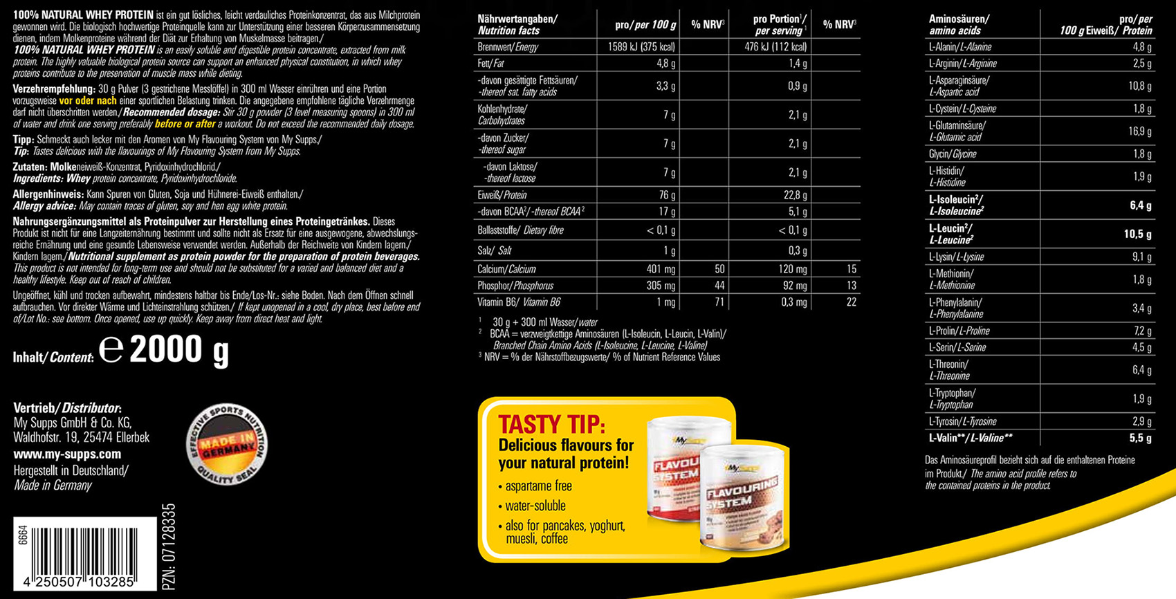 Dieses Erzeugnis ist ein hochwertiges Wheykonzentrat, das nicht mit Süss- oder Zusatzstoffen versehen wurde. My Supps 100% Natural Whey Protein besteht aus reinem Molkeneiweiss, welches einen hohen BCAA-Anteil aufweist.