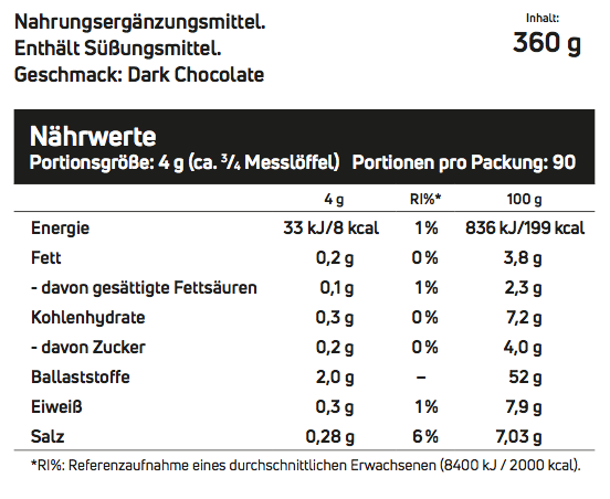 Dark Chocolate: Füllstoff (Inuline), Kakaopulver, Geschmacksverstärker (Natriumchlorid), Geschmacksstoff (Zartbitterschokolade), Verdickungsmittel (Xanthan Gum), Süßungsmittel (Acesulfame K, Sucralose).