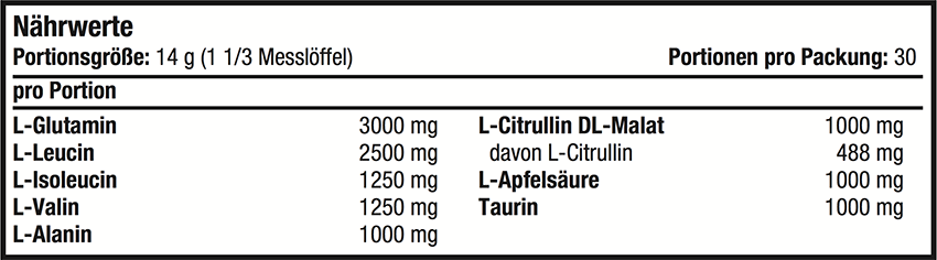 L-Glutamin, L-Leucin, L-Isoleucin, L-Valin, Aroma (Mango) Säureregulator (Zitronensäure), L-Alanin, L-Citrullin DL-Malat 1:1, Taurin, Apfelsäure, Süssungsmittel (Acesulfame K, Sucralose), Farbstoffe (E142, E101) Kann Spuren von Milch-, Soja-, und Eiproteinen, Gluten, Nüssen und Erdnüssen, Fisch und Krustentieren enthalten.t.