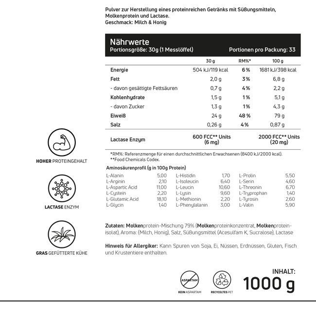 Strawberry-Banana: Hochwertige Proteinmischung (ultrafiltriertes, pasteurisiertes und instantisiertes Molkenprotein-Konzentrat und pasteurisiertes Molkenprotein-Konzentrat [aus Milch, Emulgator: Sojalecithin]), Aromen (Erdbeer, Banane), Natriumchlorid, Süssungsmittel (Acesulfam K und Sucralose), Verdickungsmittel Xanthan, instantisiertes Molkenprotein-Isolat (aus Milch, Emulgator: Sojalecithin), Bromelain extrahiert aus Ananas comosus (1200 GDU/g), Papain extrahiert aus Carica papaya (1,5 FIP u/mg).