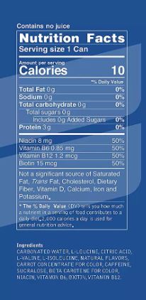 Kohlensäurehaltiges Wasser, verzweigtkettige Aminosäuren (L-Leucin, L-Valin, L-Isoleucin), Koffein,Vitamine (Niacin, B6, Folsäure, Biotin, D, B12), Säureregulator (Zitronensäure), Aroma, Süssstoff (Sucralose).