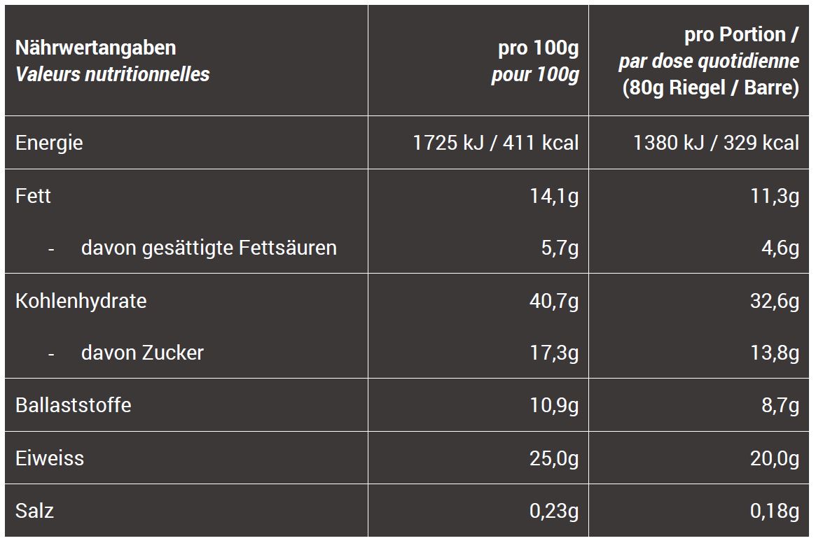 Banana Chocolate: 15% kakaohaltige Fettglasur (ungehärtetes Pflanzenfett (Palmkern, Palm, Shea), Füllstoff: Polydextrose, MilchProtein-Konzentrat, stark entöltes Kakaopulver, MagerMilchpulver, Emulgator: Lecithin, natürliche Aromen, Süssstoff Acesulfam K)), Haferflocken, Feuchthaltemittel: Glycerin, 12% Molkenproteinkonzentrat, Honig, 11% Molkenproteinisolat, (pasteurisierte Molke, Emulgator Sonnenblumenlecithin), Isomalto-Oligosaccharide, 8% Bananenpulver (100% Banane), Sonnenblumenöl, Meersalz.