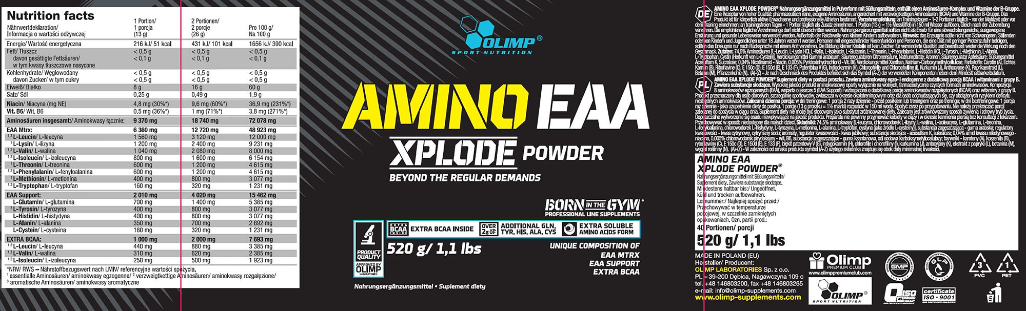 74.5% EAA mtrx [L-Leucin, L-Lysin HCl, L-Valin, L-Isoleucin, L-Threonin, L-Phenyloalanin, L-Methionin, L-Tryptophan], EAA Support [L-Glutamin, L-Tyrosin, L-Histidin HCl, L-Alanin, Cystin (Herkunft von L-Cystein)], EXTRA BCAA [L-Leucin, L-Isoleucin, L-Valin], Niacin (Nicotinamide), Vit. B6 (Pyridoxinhydrochloride); Verdickungsmittel – Gummiarabikum, Säureregulator – Apfelsäure, Zitronensäure, Natriumzitrate; Aromen, Süßungsmittel – Acesulfame K, Sucralose.
