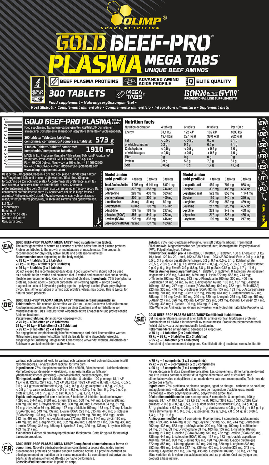 Aufgrund der Rindfleischprotein-Aminosäuren enthalten Gold Beef-Pro PLASMA-Tabletten eine hohe Dosis an natürlichen BCAAs und Glutamin. Da diese Inhaltsstoffe einen niedrigen Fett- und Kohlenhydratgehalt haben, ist Gold Beef-Pro PLASMA eine hervorragende Wahl, gerade wenn magere Muskelmasse aufgebaut werden soll.