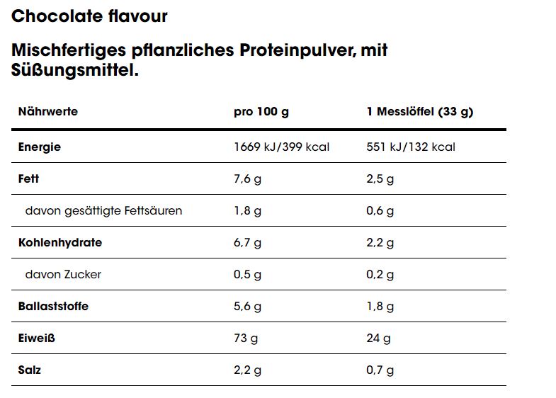 Chocolate: Erbsenprotein; Reisprotein; natürliche Aromen; Fettarmes Kakaopulver; Verdickungsmittel (Guarkernmehl, Xanthangummi); Zimt; Säuerungsmittel (Zitronensäure); L-Ascorbinsäure; Natriumchlorid; Süßungsmittel (Sucralose); Zimt; Granatapfelpulver; Cyanocobalamin