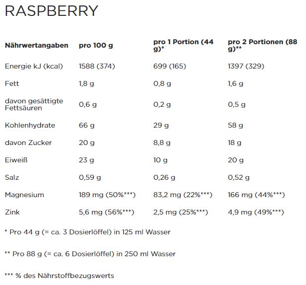 Raspberry: Maltodextrin (51%), Molkeneiweiß (Milch) (29%), Zucker, Hafermehl (2 %), Säureregulator (Citronensäure), Magnesiumcarbonat, Zinkcitrat, Salz, natürliches Aroma, Farbstoff (Betenrot), Emulgator (Sojalecithine).