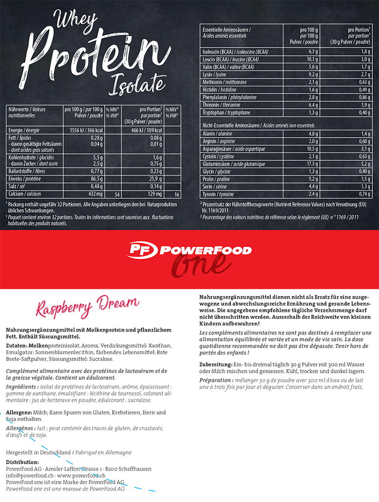 Das PowerFood One Whey Protein Isolate besteht aus reinem Wheyprotein Isolate ohne den Zusatz von Wheyprotein Konzentrat oder minderwertigerem Eiweiss. Die Aromas sind in möglichst natürlicher Art beigefügt. So werden z.B. bei den jeweilgen Geschmacksrichtungen natürliche Kokosnussraspeln oder fettarmes Kakaopulver beigemischt.