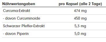 Eine CURCUMA Kapsel enthält 474 mg natürliches Kurkuma-Extrakt und liefert damit 450 mg wertvolle Curcuminoide. Um die Bioverfügbarkeit des Kurkuma-Extraktes zu erhöhen, enthalten die CURCUMA Kapseln zusätzlich ein Extrakt aus Schwarzem Pfeffer mit 5 mg Piperin.