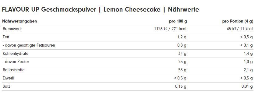 Lemon Cheesecake: Inulin, Karamellzubereitung1 (19%) (Zucker, Kakaobutter, Reisstärke, Aroma), Aroma1, Säuerungsmittel (Citronensäure), Süßungsmittel (Sucralose, Steviolglycoside aus Stevia). 1: Herkunft EU.