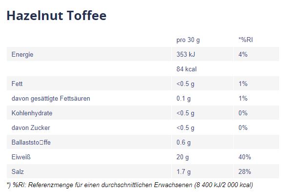 Haselnuss-Toffee: Organische Eiweißmischung (Pisane® C9 Erbseneiweiß-Isolat, Reiseiweiß, Kokosnusseiweiß, Granatapfeleiweiß, Kürbiseiweiß), Aromen (Haselnuss, Toffee), Salz, Süßungsmittel (Steviolgylcoside).