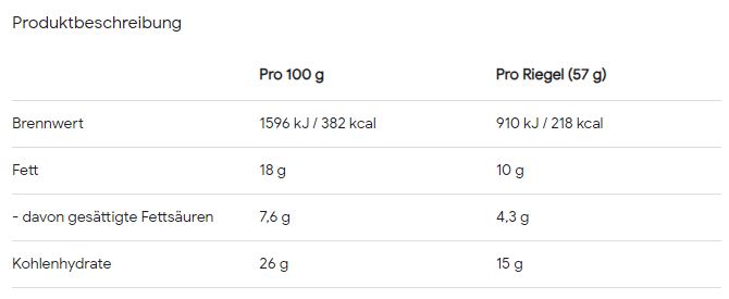Brennwert1596 kJ / 382 kcal910 kJ / 218 kcalFett18 g10 g- davon gesättigte Fettsäuren7,6 g4,3 gKohlenhydrate26 g15 g- davon Zucker3,5 g2 gProtein35 g20 gSalz1 g0,58 g