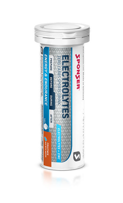 ELECTROLYTES von SPONSER – der kalorienreduzierte Durstlöscher. Liefert die Mineralstoffe Natrium, Magnesium, Calcium, Chloride und Kalium zum Ausgleich des Schweissverlustes, jedoch praktisch keine Kalorien. Zusätzlich angereichert mit Zink, welches einen normalen Fettsäurestoffwechsel unterstützt.