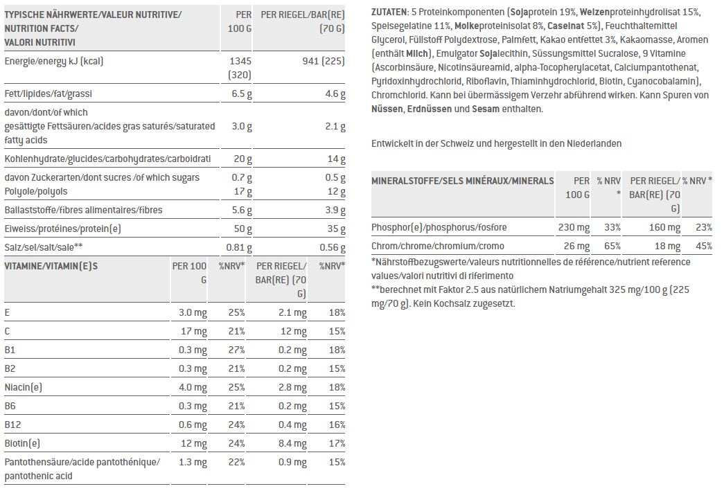 Schoko: 5 Proteinkomponenten (Sojaprotein 19%, Weizenproteinhydrolisat 15%, Speisegelatine 11%, Molkeproteinisolat 8%, Caseinat 5%), Feuchthaltemittel Glycerol, Füllstoff Polydextrose, Palmfett, Kakao entfettet 3%, Kakaomasse, Aromen (enthält Milch), Emulgator Sojalecithin, Süssungsmittel Sucralose, 9 Vitamine (Ascorbinsäure, Nicotinsäureamid, alpha-Tocopherylacetat, Calciumpantothenat, Pyridoxinhydrochlorid, Riboflavin, Thiaminhydrochlorid, Biotin, Cyanocobalamin), Chromchlorid. Kann bei übermässigem Verzehr abführend wirken. Kann Spuren von Nüssen, Erdnüssen und Sesam enthalten.