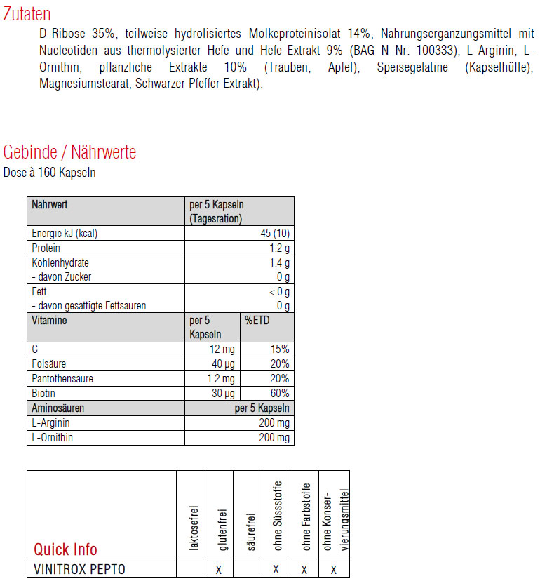 VINITROX PEPTO ist eine Kombination aus synergistisch wirkenden Inhaltsstoffen wie Polyphenolen (VinitroxTM), bioaktiven Peptiden (Whey CFM NitroTM), Nucleotiden, Ribose und schwarzem Pfeffer-Extrakt.