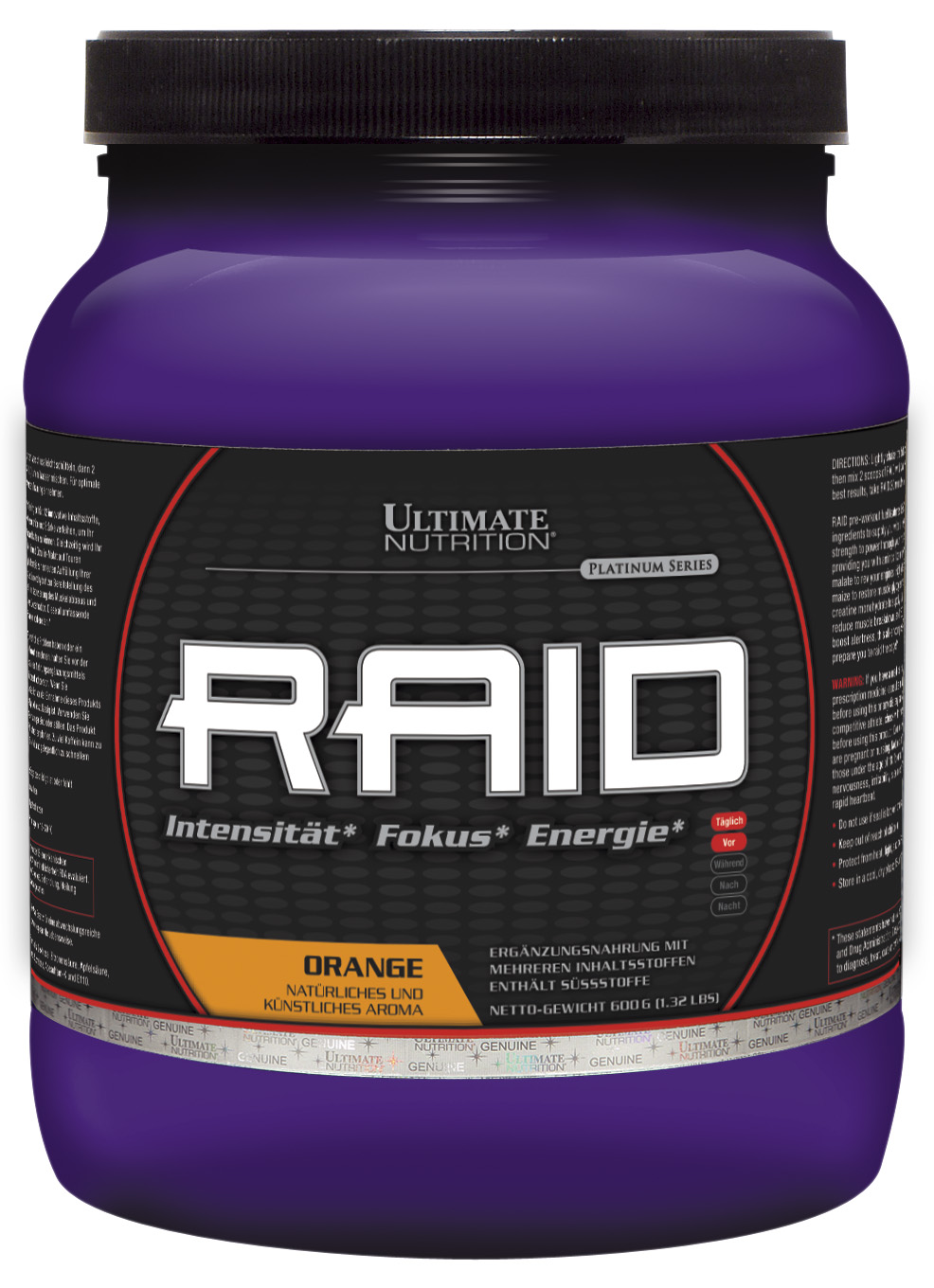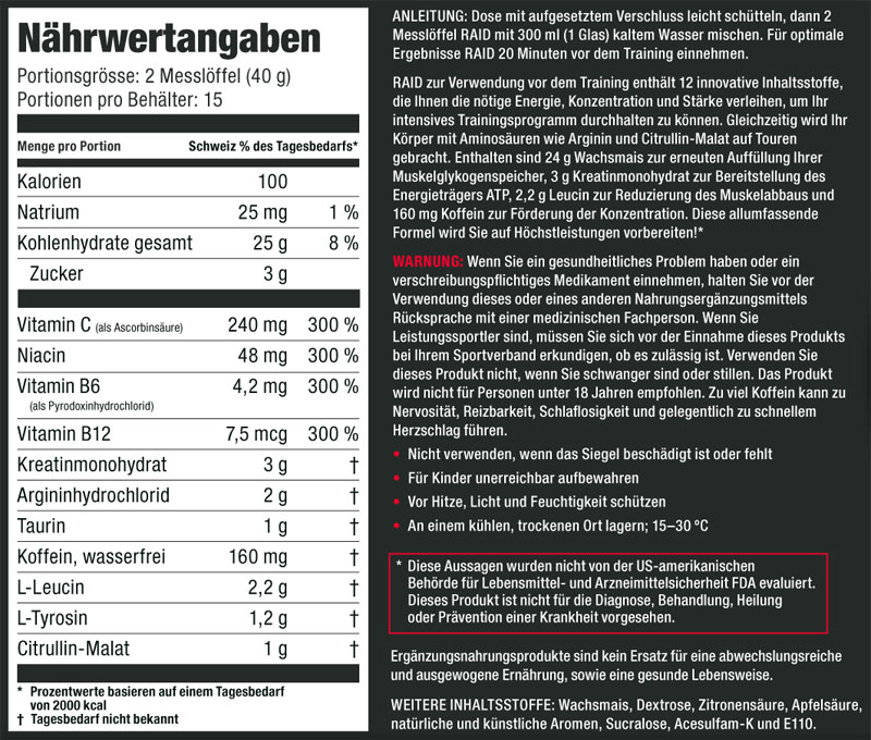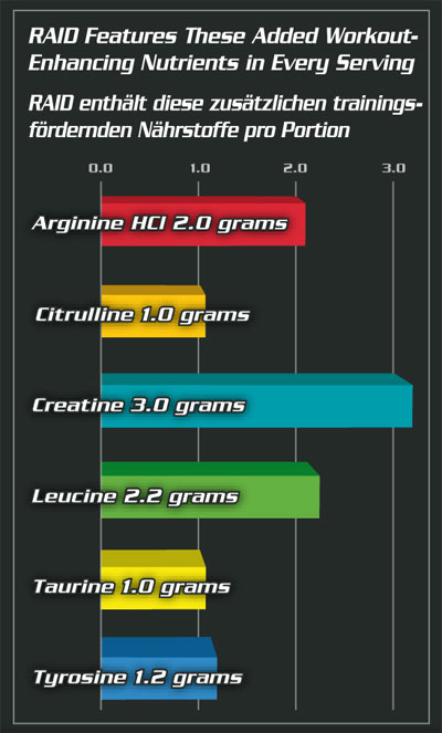 RAID zur Verwendung vor dem Training enthält 12 innovative Inhaltsstoffe, die Ihnen die nötige Energie, Konzentration und Stärke verleihen, um ihr intensives Trainingsprogramm durchhalten zu können, gleichzeitig wird ihr Körper mit Aminosäuren L-Arginin und Citrulline-Malate auf Touren gebracht. Enthalten sind 24g Wachsmaisstärke um zur erneuten Auffüllung der Muskelglykogen-Speicher, 3g Creatine Monohydrate zur Bereitstellung des Energieträgers ATP, 2.2g Leucin zur Reduzierung des Muskelabbaus und 160mg Coffein zur Förderung der Konzentration. Diese allumfassende Formel wird Sie auf Höchstleistung vorbereiten.