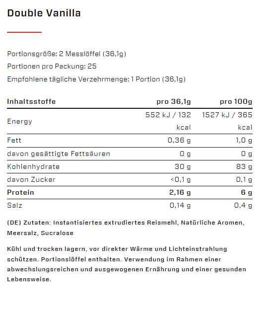 100% Instant Reismehl. Instantisiertes Reismehl, Natürliche Aromen, Meersalz, Sucralose.