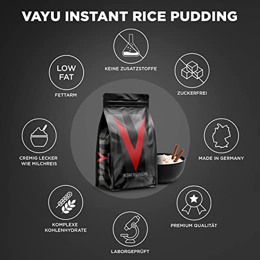 VAYU Instant Rice Pudding dient jedem Bodybuilder oder Fitnessbegeisterten als optimale Energiequelle. Die besondere Form von Reis kombiniert mit ausreichend Protein und einem perfekten Flavour lässt sich schnell zubereiten und ist einzigartig im Geschmack.
